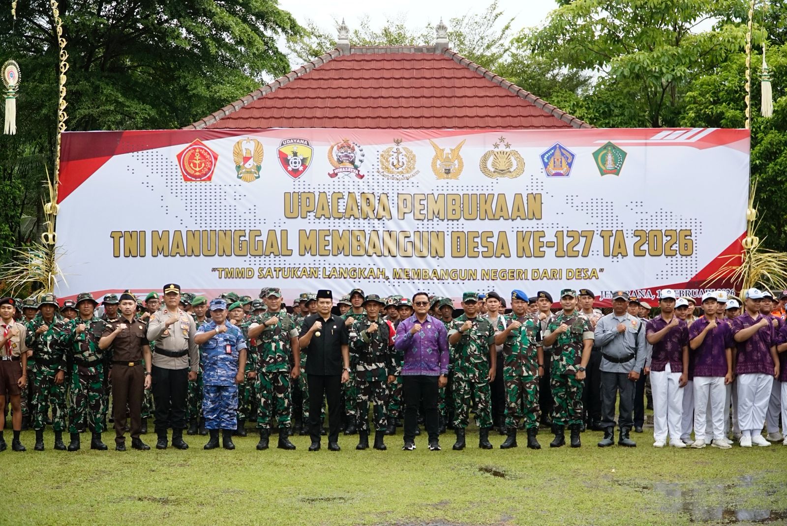 Jembrana – Kodim 1617/Jembrana secara resmi meluncurkan program TNI Manunggal Membangun Desa (TMMD) ke-127 Tahun Anggaran 2026. Upacara pembukaan dilaksanakan dengan khidmat di Lapangan SMAN 2 Mendoyo, Desa Penyaringan, dan dipimpin oleh Bupati Jembrana, I Made Kembang Hartawan, S.E., M.M.
