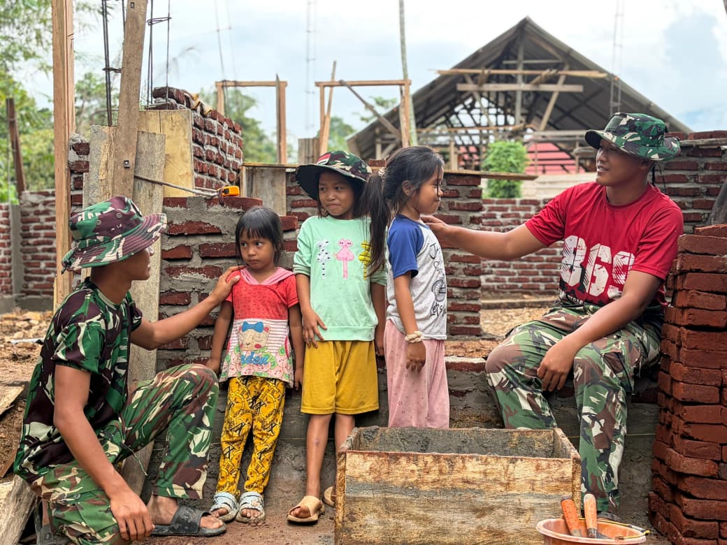 Di sela-sela kesibukan menyusun bata dan mengerjakan konstruksi, sejumlah personel TNI tampak akrab berinteraksi dengan anak-anak desa. Dengan sikap ramah dan penuh perhatian, mereka menyapa, mengajak berbincang, hingga mencairkan suasana bagi anak-anak yang awalnya terlihat malu.