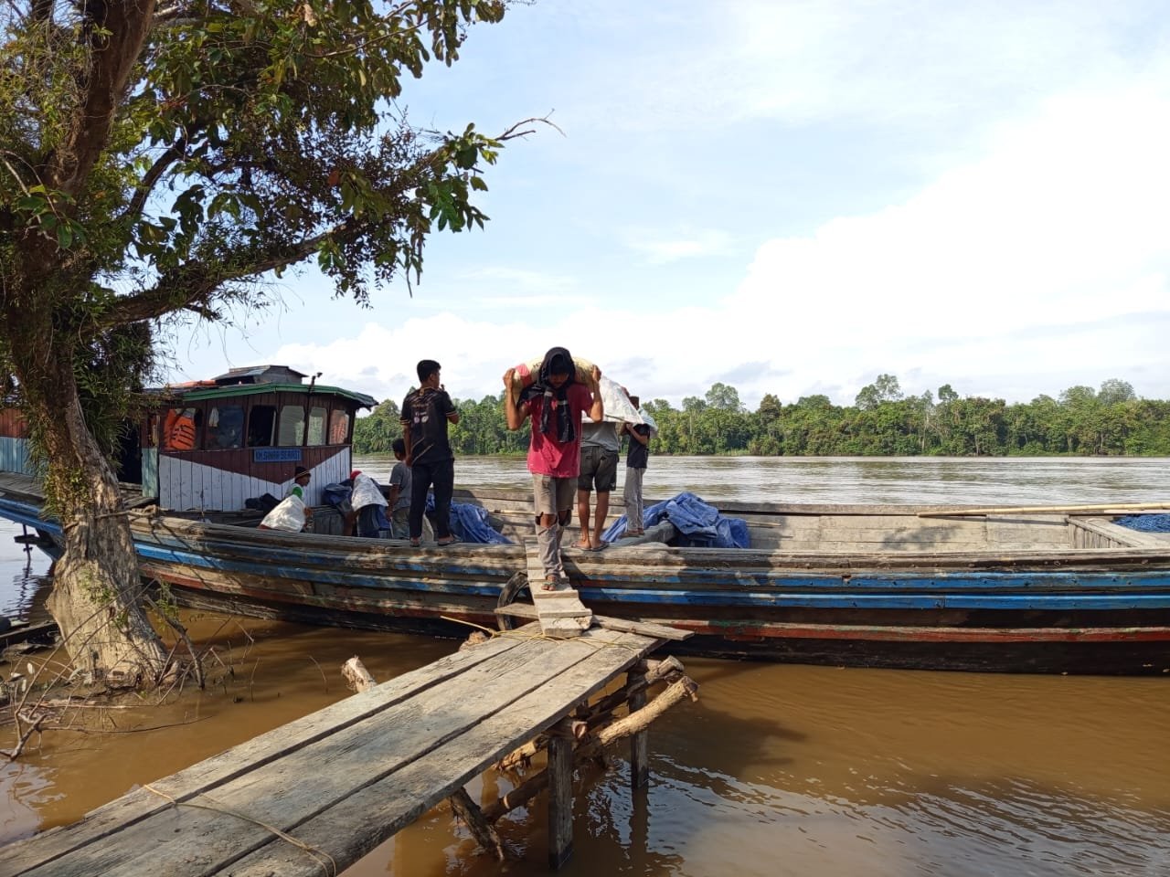 Transportasi material menggunakan klotok menjadi pilihan utama karena akses darat yang masih sulit dijangkau. Material bangunan seperti semen harus diangkut melalui jalur sungai, kemudian dibongkar secara manual dan dipindahkan ke lokasi pembangunan.