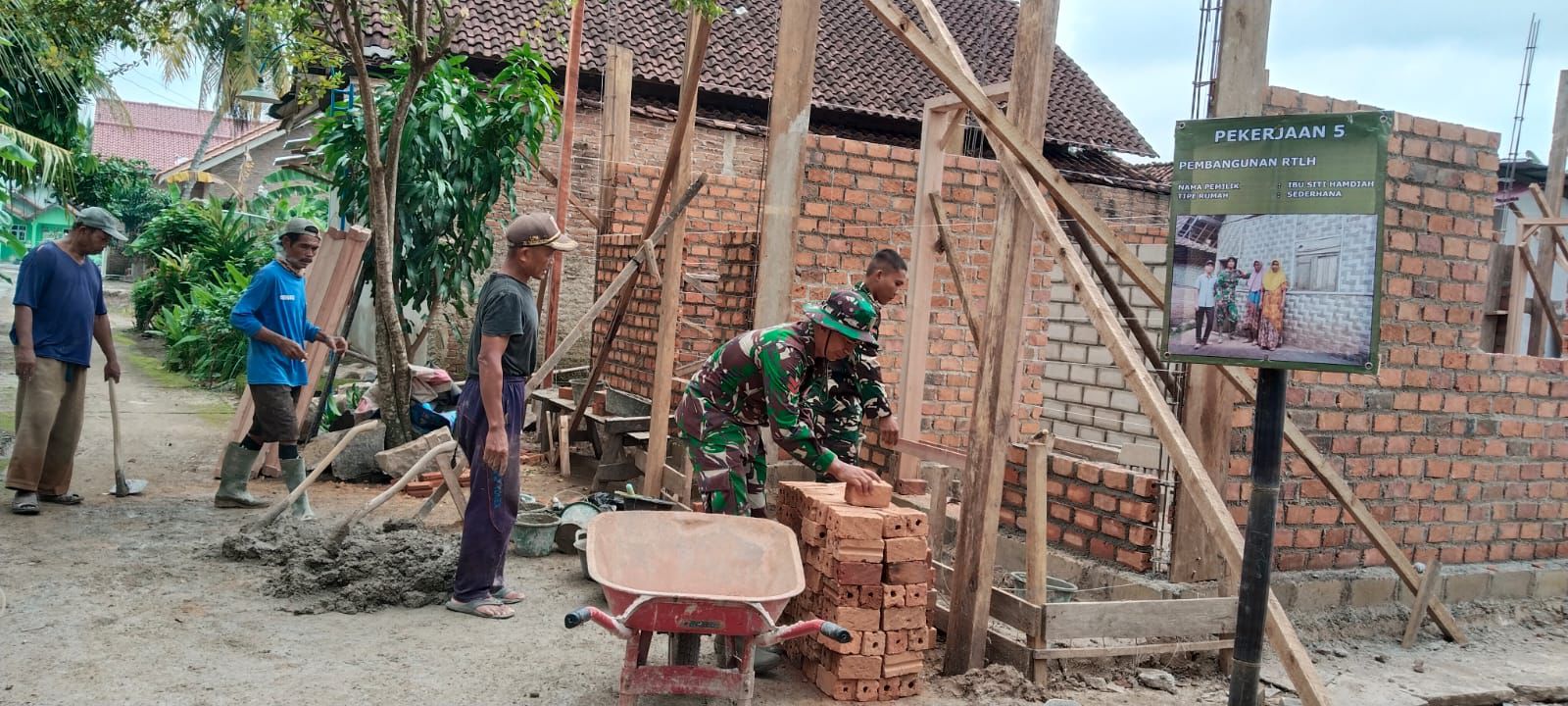 Pesawaran – Program Tentara Manunggal Membangun Desa (TMMD) terus berlanjut dengan fokus pada pembangunan Rumah Tidak Layak Huni (RTLH) untuk meningkatkan kualitas hidup masyarakat. Kegiatan kali ini berlangsung di Desa Tanjung Rejo dengan penerima manfaat yaitu Ibu Siti Hamdiyah.