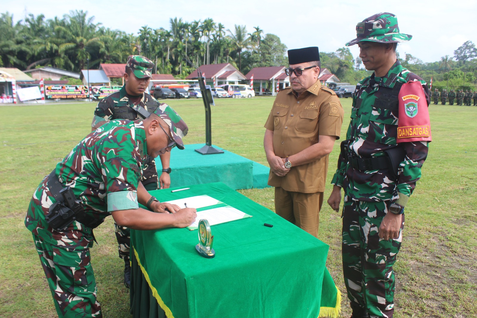Lapangan desa yang menjadi lokasi upacara pagi itu tampak dipadati peserta. Suasana penuh kebersamaan terlihat dari kehadiran unsur Forkopimda, termasuk Bupati TR. Keumangan, pejabat TNI, Polri, serta tokoh masyarakat.