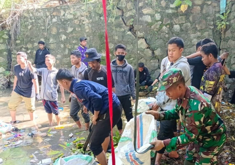 Anggota Koramil 02/Tellu Limpoe, Staf Desa, perwakilan warga, dan puluhan santri Ponpes Al Hasimiyah bahu-membahu membersihkan sampah dan tumbuhan liar yang menyumbat aliran sungai. Dengan alat seadanya, mereka bergotong royong mengangkat material penyumbat dari dalam dan sekitar sungai.