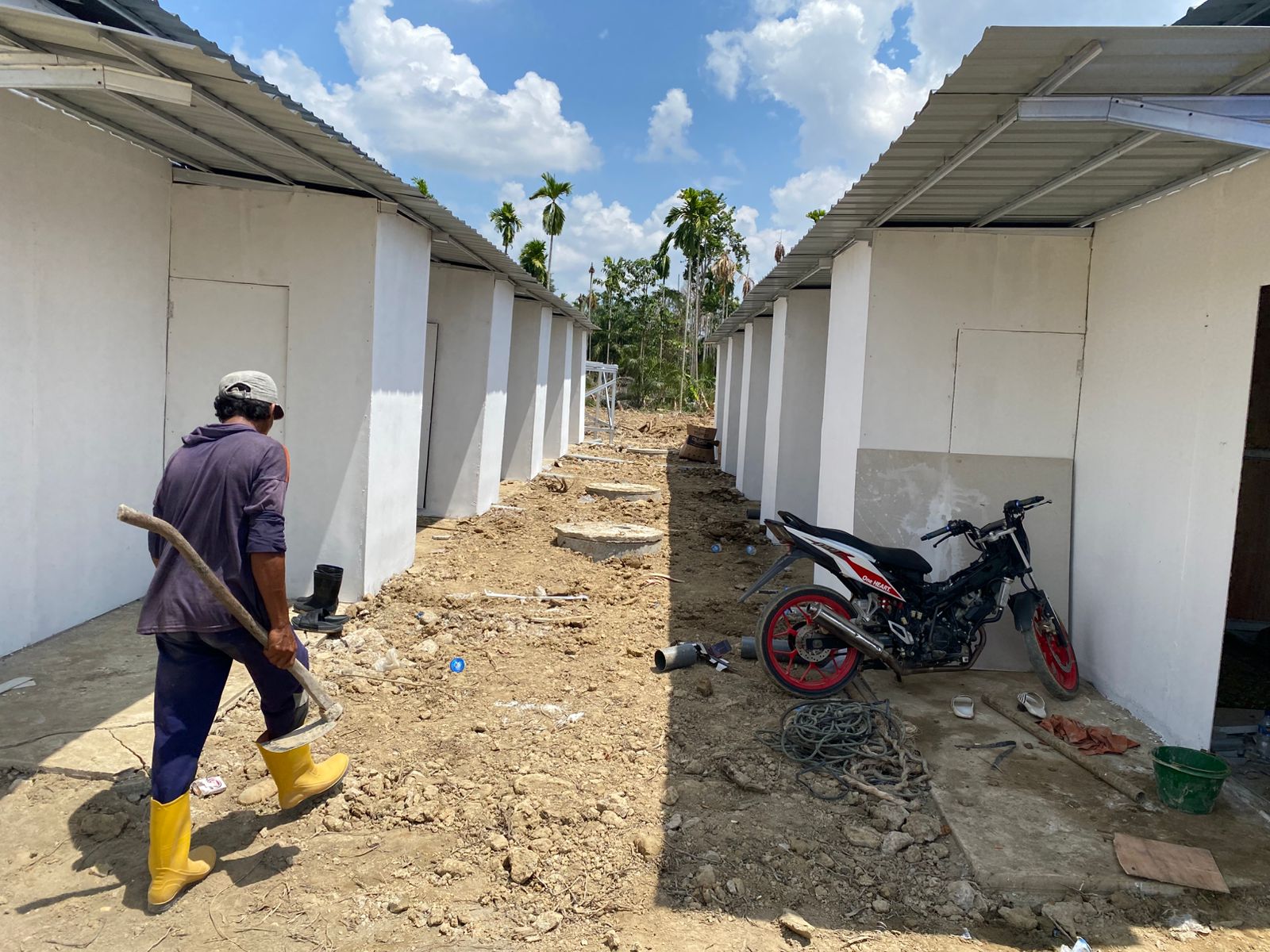 Sementara itu, di titik ketiga, Dusun Abadi, terdapat 65 unit Huntara yang sedang dikerjakan oleh PT. Haza Gumilang Abadi dengan progres mencapai 75 persen, termasuk pengecoran pondasi 80 persen dan pemasangan seng 90 persen. Di titik keempat, 30 unit Huntara baru mencapai progres 20 persen.