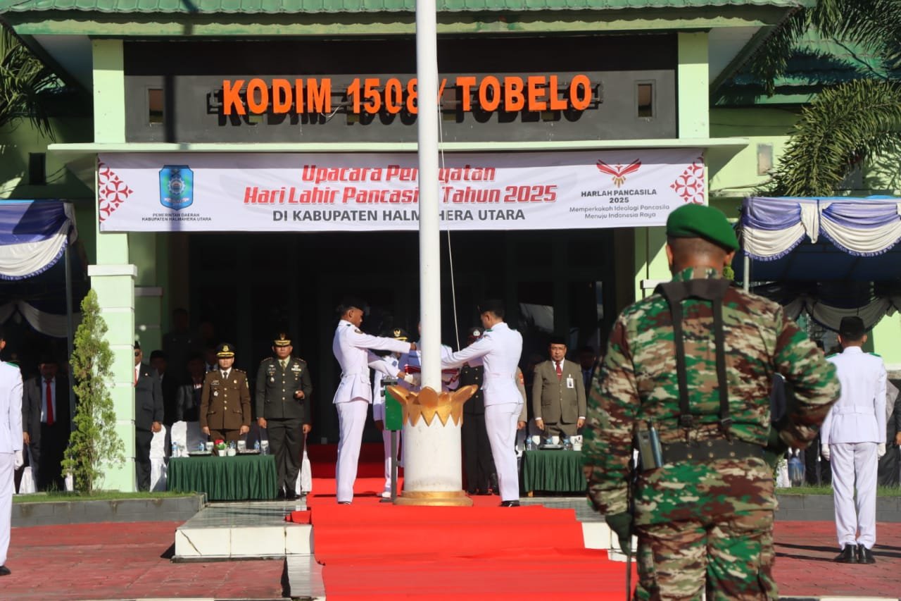 Halmahera Utara – Dalam rangka memperingati Hari Lahir Pancasila Tahun 2025, Kodim 1508/Tobelo bersama Pemerintah Kabupaten Halmahera Utara menggelar upacara resmi yang berlangsung di Lapangan Upacara Makodim 1508/Tobelo, Jalan Kawasan Pemerintahan Desa MKCM, Kecamatan Tobelo, Kabupaten Halmahera Utara sebagai bentuk penghormatan terhadap nilai-nilai luhur Pancasila sebagai dasar negara dan ideologi bangsa. Minggu, (01/06/2025)