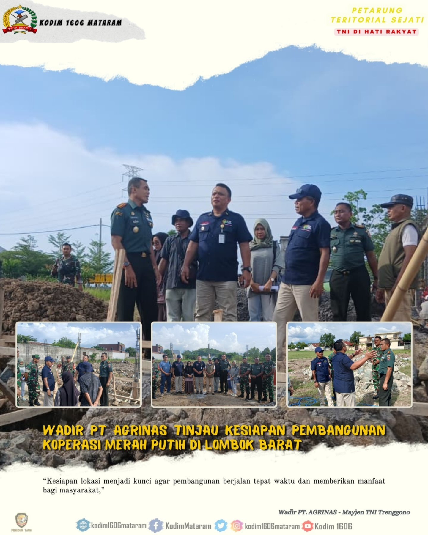 Lombok Barat, NTB — Upaya memperkuat ekonomi kerakyatan di daerah kembali mendapat perhatian serius. Wakil Direktur (Wadir) Utama PT. Agrinas, Mayjen TNI Trenggono, melakukan pengecekan langsung ke tiga lokasi pembangunan Koperasi Desa dan Kelurahan Merah Putih (KDKMP) di wilayah Kabupaten Lombok Barat, Nusa Tenggara Barat (NTB) wilayah teritorial Komando Distrik Militer (Kodim) 1606/Mataram. Kunjungan ini bertujuan memastikan kesiapan lahan serta progres pembangunan koperasi yang kelak menjadi pusat penguatan ekonomi berbasis komunitas.