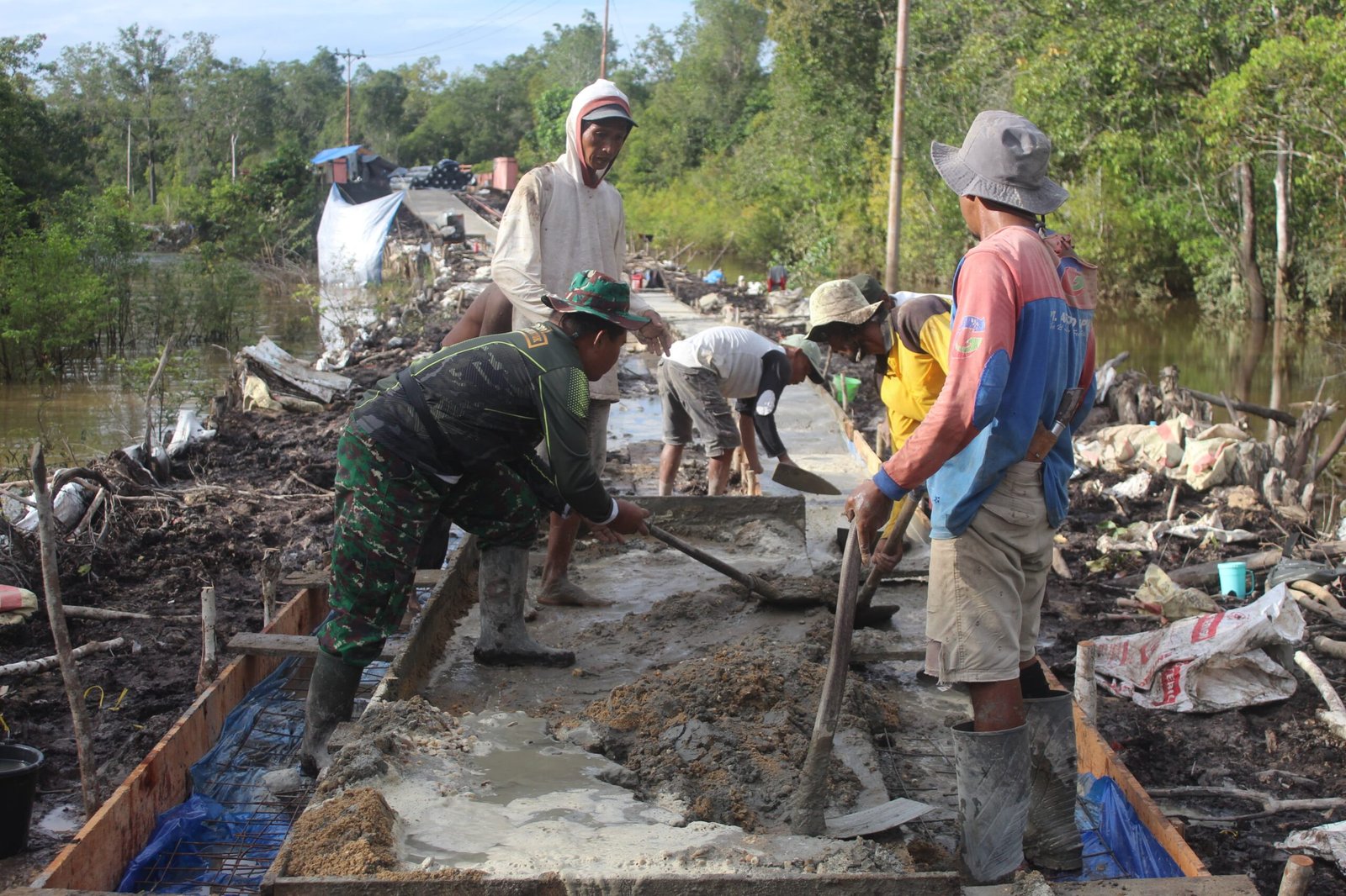 Dengan alat sederhana seperti sekop dan cangkul, warga bekerja bersama Satgas mencampur pasir, semen, dan kerikil untuk membuat adukan cor beton. Meskipun pekerjaan ini berat dan memerlukan tenaga ekstra, semangat warga tidak surut karena merasa ikut ambil bagian dalam pembangunan desa mereka sendiri.