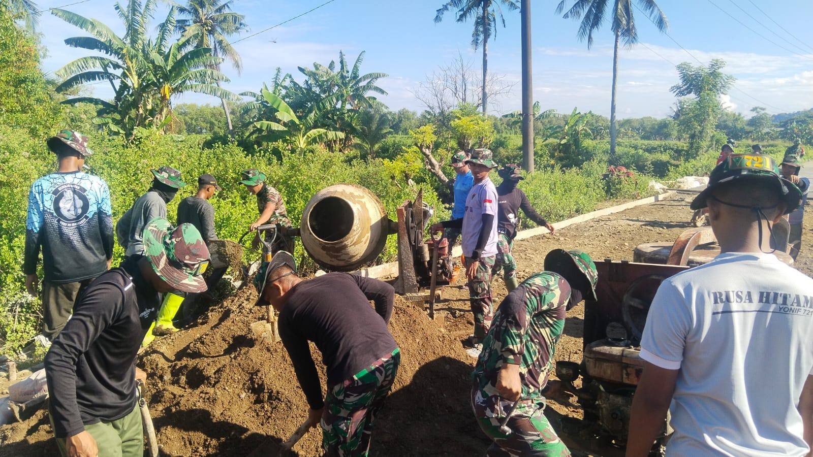 Dengan penuh semangat, anggota Satgas TMMD dan masyarakat setempat bergotong royong mengangkut material, mengaduk semen, serta menuangkan cor beton secara bergantian. Meski di bawah terik matahari, mereka tetap antusias menyelesaikan pekerjaan agar target pembangunan dapat tercapai tepat waktu.