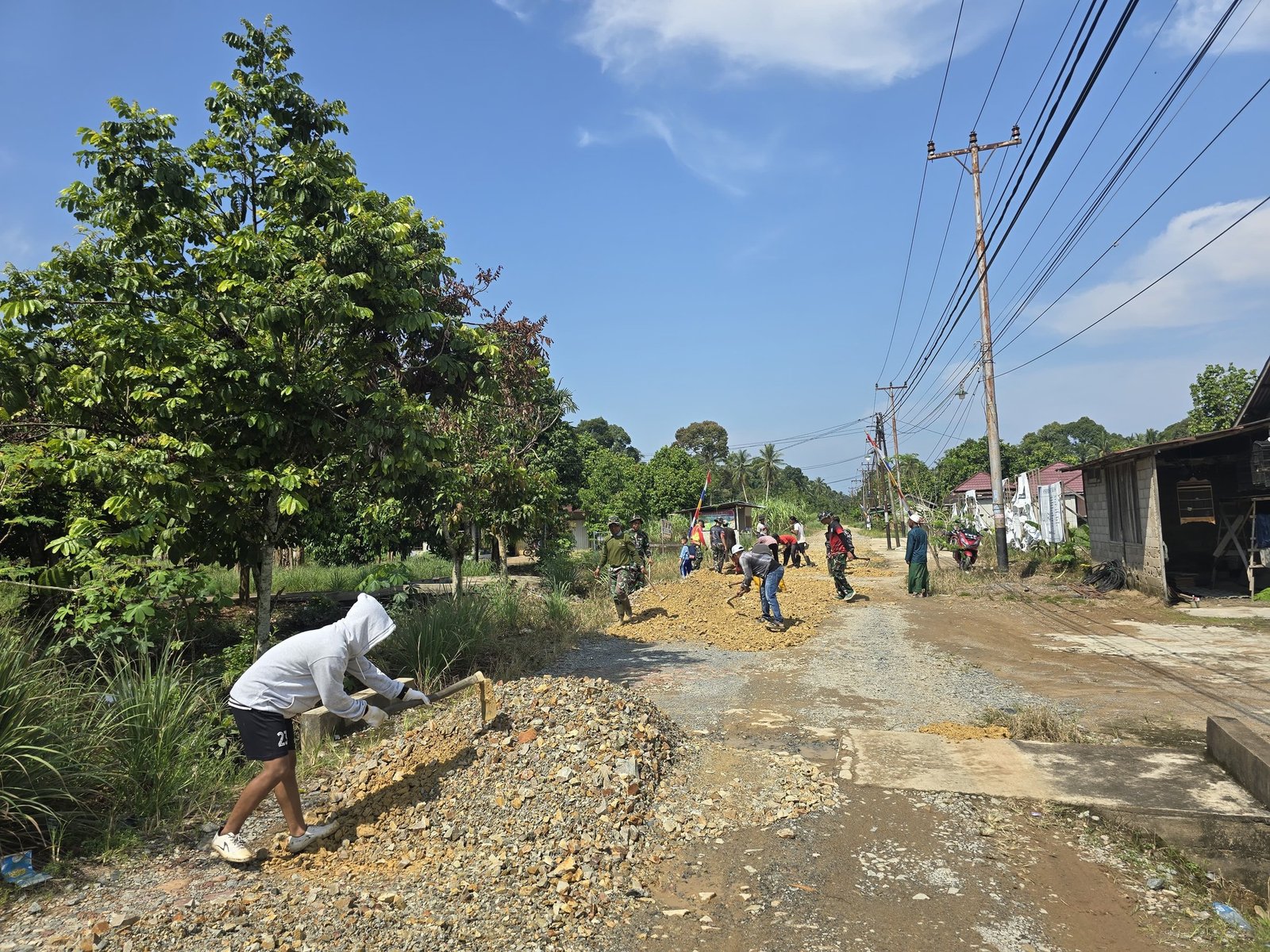 Personel Satuan Tugas (Satgas) TMMD bersama masyarakat setempat tampak antusias melakukan pengerasan dan pemerataan jalan yang akan dicor sebagai salah satu sasaran fisik utama dalam program TMMD kali ini. Dengan semangat kebersamaan, TNI dan warga bekerja bahu-membahu, saling membantu tanpa mengenal lelah di bawah terik matahari.