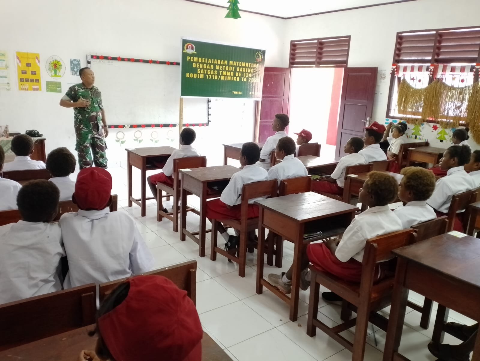 Mimika, Papua – Tidak hanya memperkenalkan Matematika Gasing, anggota Satgas TMMD ke-124 Kodim 1710/Mimika juga menghadirkan suasana belajar yang meriah dan menyenangkan melalui pelatihan yel-yel kepada siswa-siswi SDN Pigapu, Distrik Iwaka, Senin (26/5/2025).